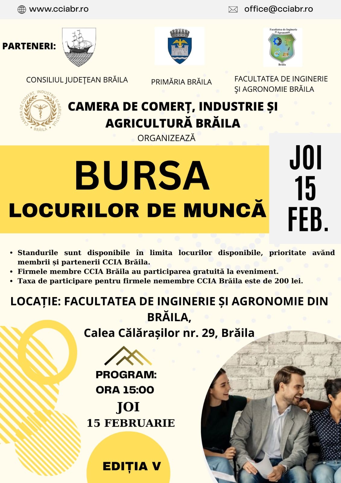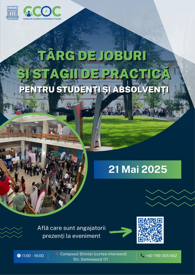 Centrului de Consiliere și Orientare în Carieră, organizează miercuri, 21 mai 2025, cea de-a șasea ediție a Târgului de joburi și stagii de practică, un eveniment dedicat studenților și absolvenților. Târgul de joburi se va desfășura în aer liber, în Campusul Științei (Curtea Interioară), str. Domnească nr. 111, între orele 11:00 și 16:00.